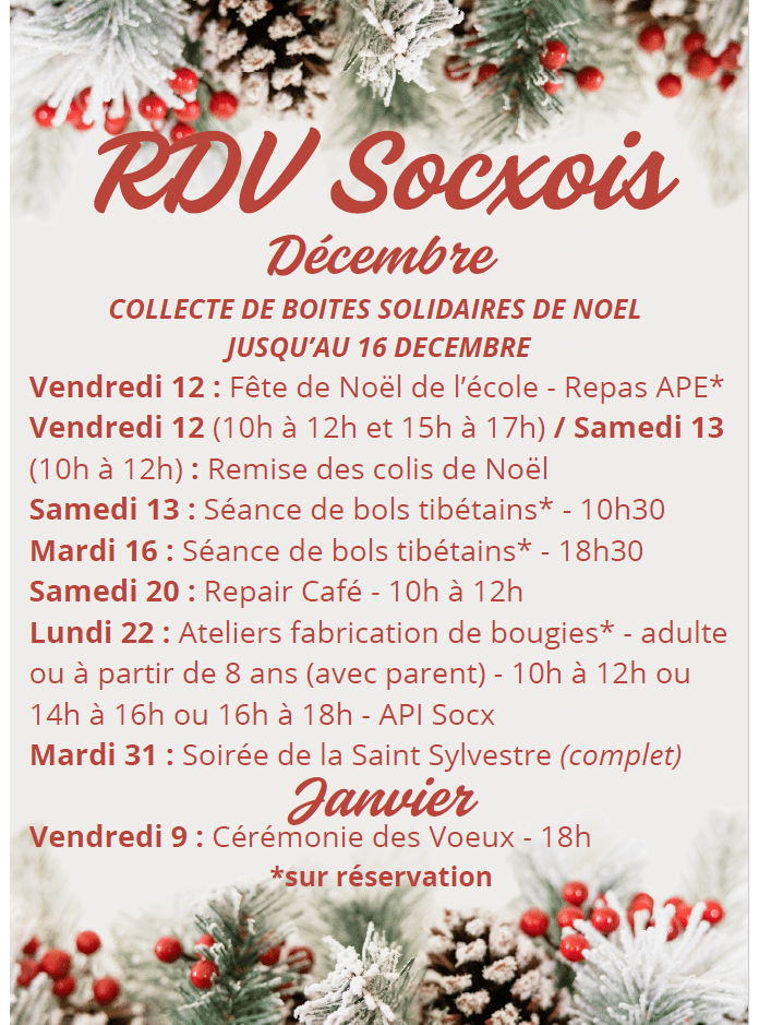 Actualités Tout Vie associative Vie municipale Vie quotidienne Vie municipale Cérémonie des voeux 2026 Publié le 15/12/2025 Vie quotidienne Calendrier du SIROM 2026 Publié le 15/12/2025 Vie associative Les rendez-vous Socxois Publié le 15/12/2025