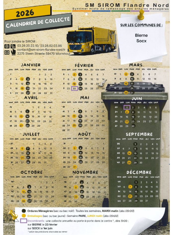 - vos emballages (sac ou bac jaune) les semaines paires le lundi matin (dès 05h00)