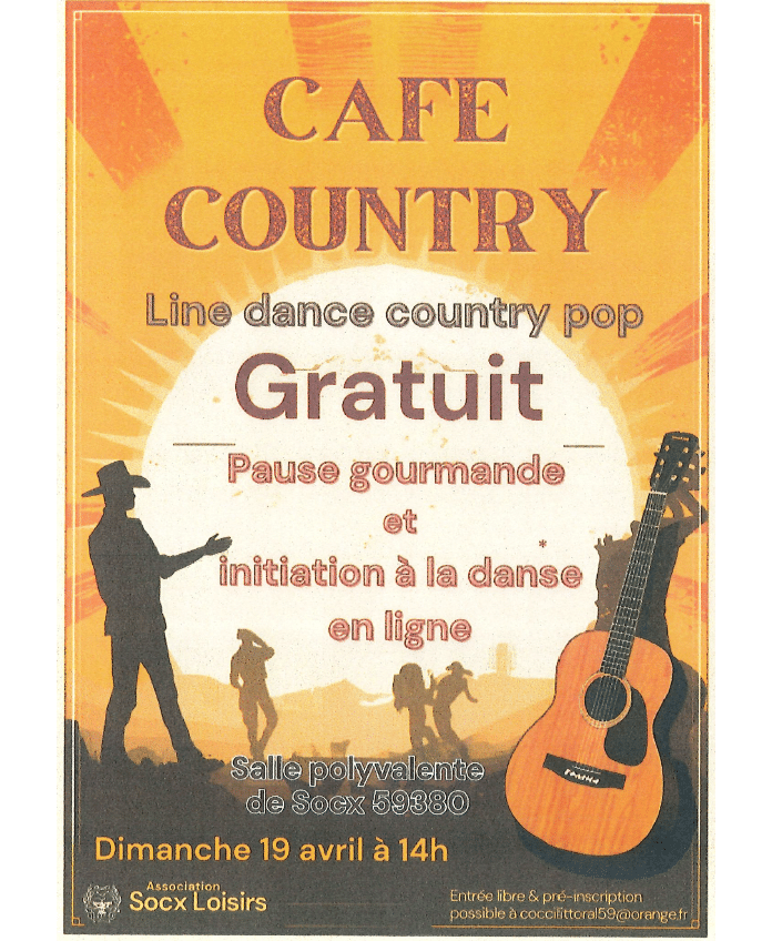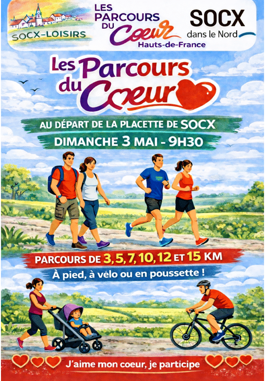 AGENDA Tout Vie associative DIMANCHE 19 AVRIL 2026 CAFE COUNTRY salle polyvalente 14H00 DIMANCHE 03 MAI 2026 PARCOURS DU COEUR Placette de Socx 09H30 19 MAI 2026 4 jours de Dunkerque SOCX 24 et 25 juillet 2026 WOOD SOCX Parc de SOCX