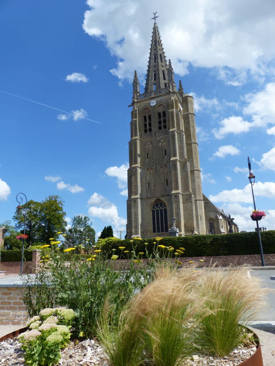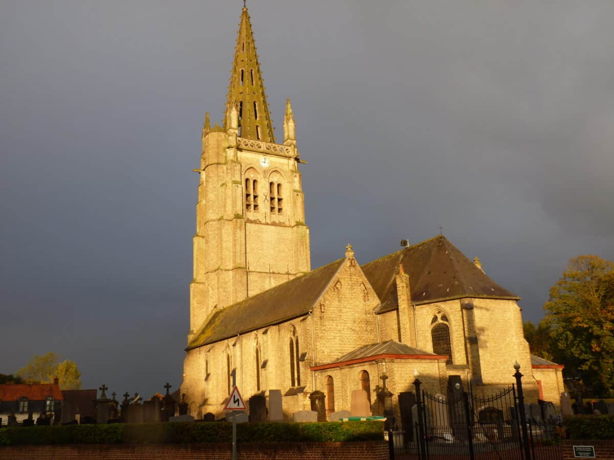 L’église, entourée du cimetière communal, est une hallekerque à trois nefs en briques blondes, bâtie au XVIIe siècle, mais agrandie en 1894 d’une quatrième travée et d’un chœur allongé. La hallekerque a été construite dans le prolongement de la tour porche du XVIe siècle.