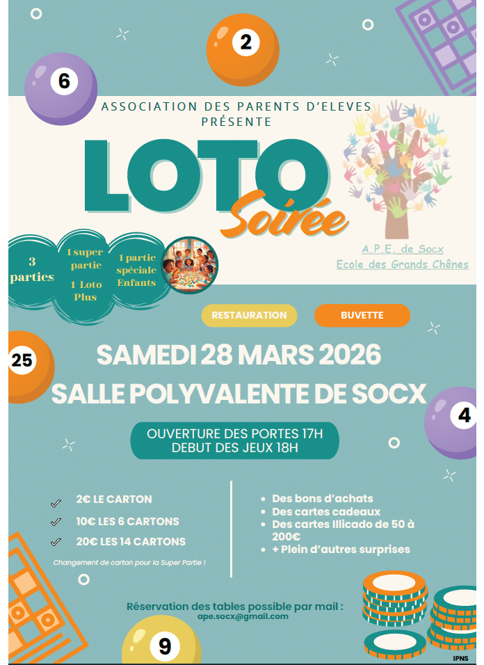 L’association des parents d’élèves de l’école de SOCX organise le samedi 28 mars 2026, salle polyvalente, une soirée LOTO.