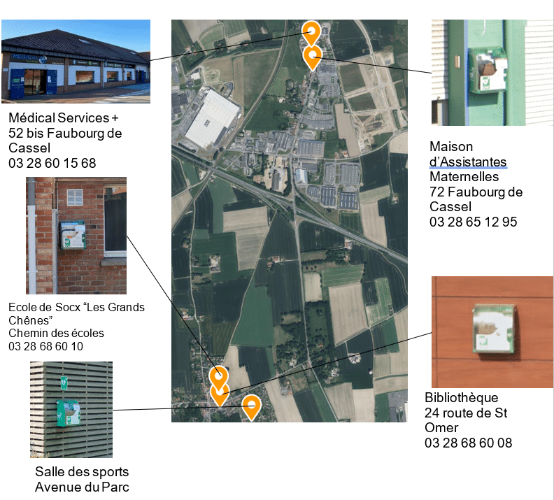 Localisation des différents défibrillateurs sur la commune de Socx :
